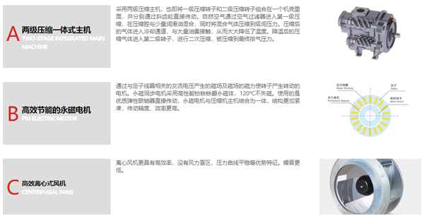 空压机品牌哪家好,空压机节能选择艾高永磁变频空压机。艾高BPM110两级压缩永磁变频螺杆式空压机采用两级压缩主机,也即将一级压缩转子和二级压缩转子组合在一个机壳里面,并分别通过斜齿轮直接传动。自然空气通过空气过滤器进入第一级压缩,在压缩腔与少量润滑油混合,同时将混合气体压缩到级间压力。